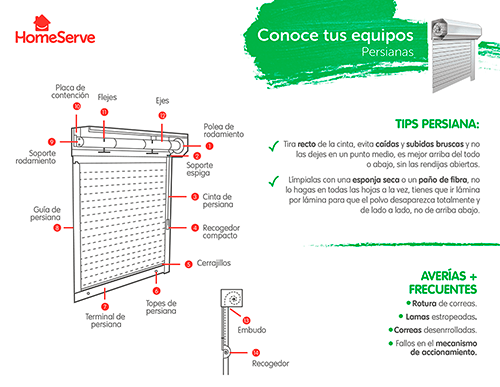 Para ayudarte en esta tarea te contamos qué piezas componen el mecanismo de una persiana y cómo cambiar la cinta o los tirantes. COMO ARREGLAR UNA PERSIANA CAMBIANDO LAMA Y CINTA O CORREA. En HomeServe contamos con profesionales especialistas en arreglar persianas eléctricas a domicilio.